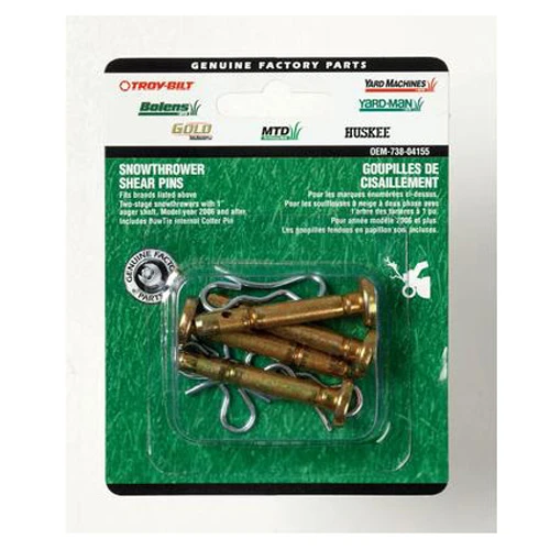 Écrou de sécurité pour souffleuse à neige. Pour les souffleuses à neige à deux phases avec arbre de vis sans fin. Paquet de 4. Convient aux souffleuses à neige à deux tempss de la série MTD 900, 2007 et suivantesContenu de l’emballage (4) goupille de cisaillement 1/4″ x 1-3/4″, (4) clipInstallation rapideSert à protéger les souffleuses contre les dommages lorsque la turbine entre en contact avec un objet solideComprend des goupilles en noeud papillon