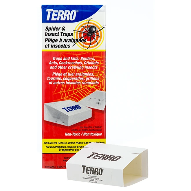 Ces pièges à araignées et insectes TERRO vous permettront de piéger et de tuer aisément les insectes rampants tels que les fourmis, les blattes, les grillons et les araignées, ainsi que les recluses brunes, les veuves noires et les tégénaires des champs. Les insectes sont piégés et meurent dès qu’ils entrent en contact avec la surface collante. Chacun des quatre pièges à araignées contenu dans ce paquet peut être installé à plat ou plié. Étant non toxiques et exempts de pesticide, ces pièges à colle peuvent être utilisés sans danger dans les maisons, les commerces, et même autour des enfants et des animaux de compagnie. Piège et tue les araignées, les scorpions, les fourmis, les cafards, les grillons et autres insectes indésirablesSûr, non-toxique, sans pesticidePratique, facile à utiliser