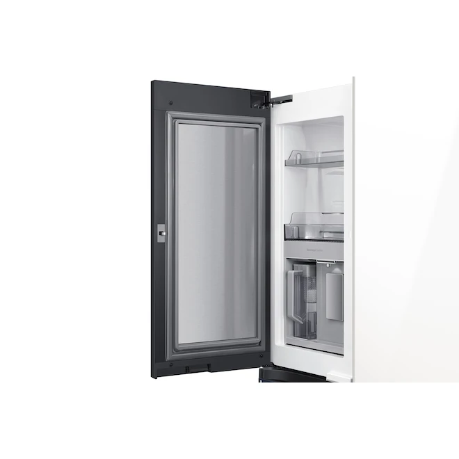 Créez le réfrigérateur que vous voulez avec la flexibilité dont vous avez besoin. Ce réfrigérateur de 36 pouces à 4 portes Flex Bespoke de Samsung possède une conception personnalisable avec un choix de motifs et couleurs. Le centre de boissons permet un accès rapide et facile à des boissons fraîches, tandis que la machine à glaçons double fournit deux types de glaçons pour différentes occasions et libère de l’espace dans le réfrigérateur. Le réfrigérateur offre un rangement flexible pour ranger de manière optimale différents types d’aliments et le filtre désodorisant UV préserve la fraîcheur et la saveur des aliments en éliminant les odeurs désagréables. La capacité de 29 pi³ vous permet de stocker encore plus d’aliments de manière ordonnée pour qu’il soit facile et rapide de les placer, de les trouver et de les sortir. Le triple refroidissement et le refroidissement précis conservent la fraîcheur des aliments plus longtemps et empêchent les odeurs de se mélanger. Rendez votre cuisine plus élégante et uniqueLe centre de boissons permet un accès rapide et facile à des boissons fraîches et aromatiséesLa double machine à glaçons fournit deux types de glaçons pour différentes occasions et libère de l’espace dans le réfrigérateurStockage polyvalent : utilisez les compartiments spécialisés pour stocker de manière optimale différents types d’alimentsLe filtre désodorisant aux UV préserve la fraîcheur et la saveur des aliments en éliminant les odeurs désagréablesLe design met en valeur votre maison grâce à une apparence minimaliste et épuréeGrande capacité de 29 pieds cubes. Permet de ranger encore plus d’aliments de manière ordonnée, afin qu’il soit facile et rapide de les placer, de les trouver et de les sortirLe triple refroidissement et le refroidissement précis maintiennent la fraîcheur des aliments plus longtemps et empêchent les odeurs de se mêler