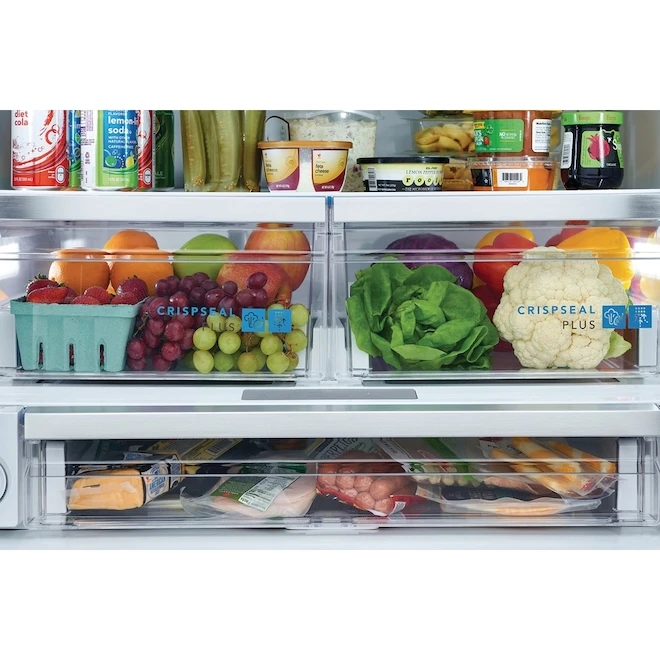Ce réfrigérateur à portes françaises par Frigidaire aide à conserver la fraîcheur des fruits et légumes plus longtemps grâce au bac à légumes CrispSeal qui empêche l’air sec de pénétrer dans le bac à légumes. Restez organisé avec le tiroir à charcuterie pleine largeur et le grand bac de rangement dans la porte. Gardez les produits frais plus longtemps et évitez qu’ils ne se ratatinent prématurément grâce aux bacs à légumes CrispSeal. Nos grands bacs offrent plus de rangement dans la porte, sans sacrifier l’espace précieux des étagères. Le filtre à eau PurePour réduit jusqu’à 99% des contaminants, diminue la quantité de plastique et réduit le coût de l’eau en bouteille. Évitez les aliments avariés grâce à nos portes à fermeture automatique, qui garantissent que les portes ne restent jamais légèrement ouvertes en se fermant automatiquement dès que la porte est entrouverte de 5 pouces ou moins. Les bacs à légumes CrispSeal® Plus, dotés de la technologie Auto Humidity, éliminent automatiquement l’excès d’humidité. De plus, un filtre à éthylène réduit le gaz émis par de nombreux fruits et légumes et qui entraîne leur détériorationMaximisez l’espace utilisable grâce à notre système d’organisation ingénieuxTiroir de température qui offre 3 réglages de température pour s’adapter à vos besoinsDoté de technologies qui réduisent les déchets alimentaires et la consommation d’énergie, notre réfrigérateur est une option intelligente pour l’environnement et votre porte-monnaie