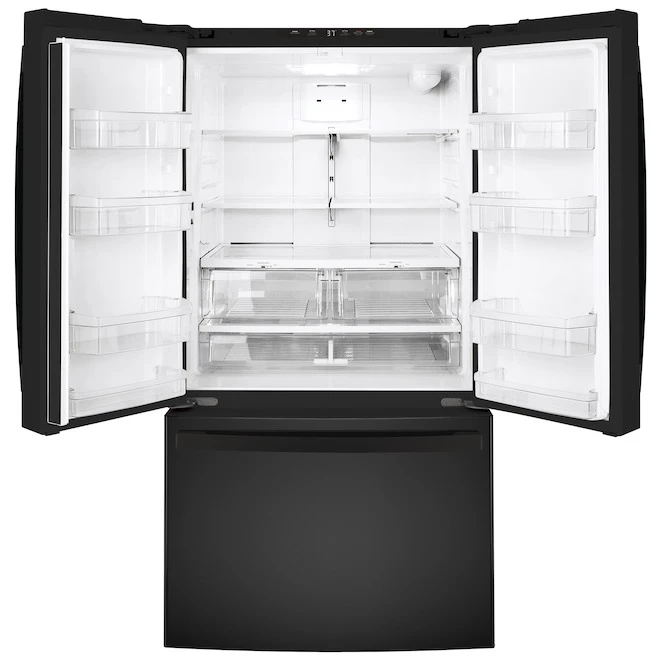Rehaussez le look raffiné et professionnel de votre cuisine avec ce réfrigérateur à portes françaises GE. Cet appareil noir et silencieux de 26,7 pi³ permet de conserver une grande quantité d’aliments plus longtemps grâce à ses nombreux balconnets, son bac à charcuteries à température contrôlée et ses 2 paniers à fruits et légumes à humidité contrôlée. Le congélateur est doté de la technologie FrostGuard qui prévient l’accumulation de givre afin de réduire le risque de brûlures de congélation. Son distributeur encastré offre de la glace et de l’eau, qui sont filtrées à l’aide d’un système de filtration haut de gamme qui retient les résidus pharmaceutiques souvent retrouvés dans l’eau courante. Ce réfrigérateur certifié Energy Star vient avec une garantie limitée d’un an sur les pièces et la main d’œuvre. Le distributeur à l’intérieur et la machine à glaçons installée en usine sont équipés d’un système évolué de filtration des produits pharmaceutiques, qui produit une eau et une glace extrêmement propres et fraîches.Homologation Energy Star(MD) : l’appareil est conforme aux normes du gouvernement fédéral, voire les dépasse, de sorte qu’il vous fait économiser énergie et argent à longueur d’année.La tablette QuickSpace(MC) coulisse aisément pour faire place aux articles de grande tailleLe brillant éclairage progressif à DEL dans les compartiments d’aliments frais et congelés illumine l’intérieur, ce qui améliore la visibilité et facilite l’accès.Distributeur d’eau à l’intérieur : vous n’avez qu’à appuyer sur un bouton pour vous verser de l’eau froide au goût frais, à partir du distributeur d’eau, qui se trouve à l’intérieur, ce qui ne compromet pas l’apparence du réfrigérateur.Grâce à la technologie FrostGuard(MC), le dégivrage du congélateur n’est effectué qu’en cas de besoin pour éviter les brûlures de congélation.
