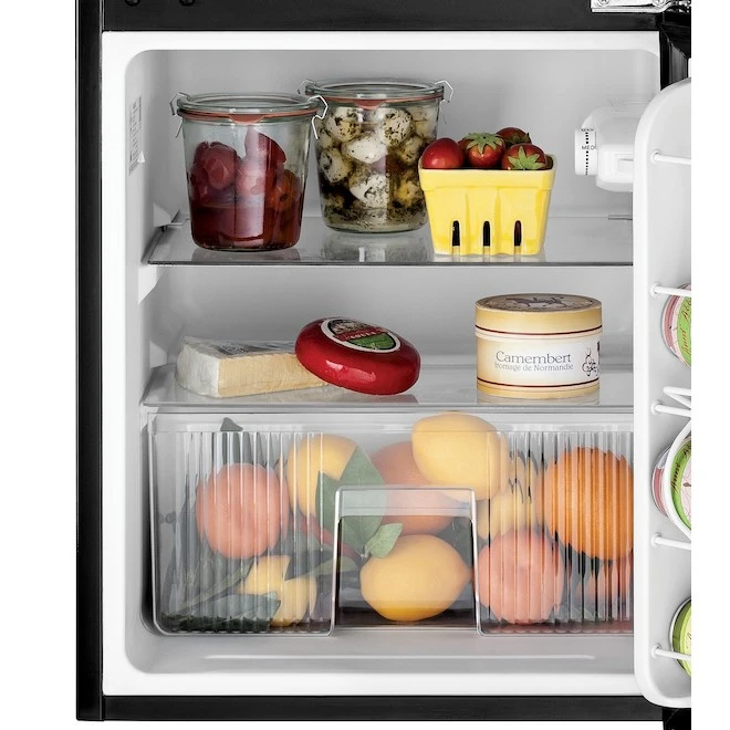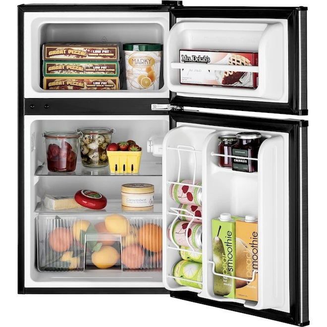 Le réfrigérateur compact à deux portes GE comprend 2 compartiments distincts pour vos aliments frais et surgelés. Les étagères en verre faciles à nettoyer, le tiroir bac transparent pour les fruits et les légumes, les bacs de porte et le support pour vos boissons préférées optimisent les possibilités de rangement des aliments. Les portes arrondies dotées de poignées encastrées ont une belle apparence lisse et facilitent l’ouverture et la fermeture. Réfrigérateur compact à double porte Energy Star(MD) d’une capacité de 3,1 pi³La capacité de congélation de 0,93 pi³ vous permet de stocker des aliments congelésS’allume automatiquement lorsque la porte des aliments frais est ouverteOffre un environnement de stockage idéal pour les fruits et légumesCrée un stockage pratique des aliments grâce à des étagères faciles à nettoyerLes petits récipients et les boîtes sont faciles à trouver dans les bacs de isolés