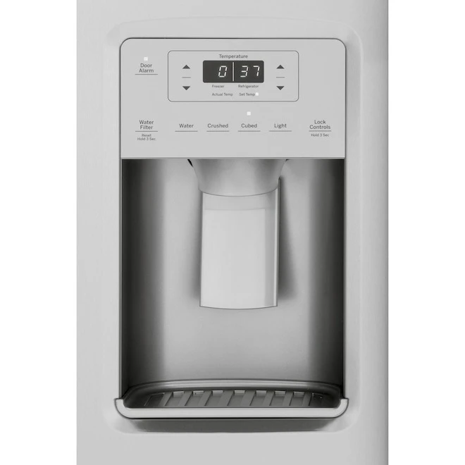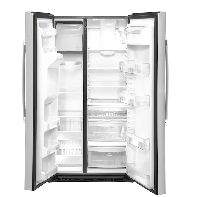 Repensez l’organisation des aliments avec ce réfrigérateur côte-à-côte GE de 21,8 pi³, disposant de multiples possibilités de rangement pour tous vos ingrédients et repas frais et surgelés. Même les plus petits aliments peuvent être trouvés en un rien de temps grâce aux lumières DEL affleurantes qui éclairent chaque recoin des sections du réfrigérateur et du congélateur. Les clayettes coulissantes réglables du réfrigérateur offre un aspect poli bord à bord, sont faciles d’accès pour le nettoyage et s’étendent sur toute la largeur du réfrigérateur. Les tiroirs à niveaux multiples offrent un environnement de conservation idéal pour vos nombreux fruits et légumes. La finition en acier inoxydable possède un revêtement résistant aux traces de doigts. Votre appareil aura ainsi un look toujours impeccable. De plus, ce réfrigérateur vous donne un accès facile à une eau fraîche et purifiée. Le système de filtration d’eau avancé comprend un filtre de remplacement XWFE qui élimine jusqu’à 98% des traces de produits pharmaceutiques de votre eau potable. Acier inoxydable résistant aux empreintes digitales : éliminez facilement les taches et les traces de doigt pour un fini toujours impeccableTrouvez facilement les aliments, même les plus petits, grâce aux lumières DEL qui éclairent tous les coins du réfrigérateur et du congélateurProfitez d’un aspect encastré dans votre cuisine grâce à la conception à profondeur de comptoirStockez en toute sécurité une variété d’articles sur des tablettes en verre, y compris une tablette pour petites douceurs située au-dessus des bacs à glace; l’endroit le plus froid du congélateurProfitez d’une apparence soignée et d’un nettoyage facile grâce aux tablettes de verre bord à bord qui s’étendent sur toute la largeur du réfrigérateurLes bacs de porte transparents réglables offrent un espace idéal pour les grands récipients et libèrent un espace précieux sur les tablettes