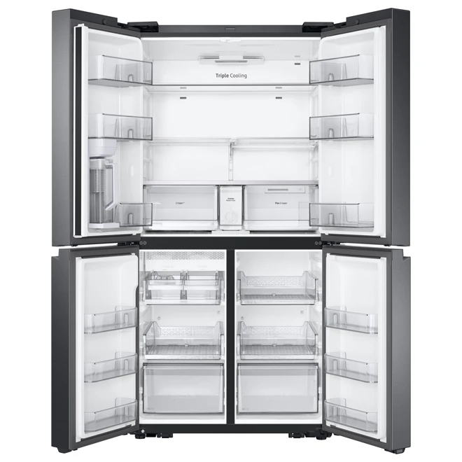Le tout nouveau réfrigérateur Flex à 4 portes de Samsung comprend un pichet d’eau à remplissage automatique et une machine à glaçons automatique double, ainsi qu’un espace de rangement polyvalent. Le pichet à eau à remplissage automatique vous permet de profiter d’une eau fraîche et aromatisée naturellement, prête à servir à tout moment. La machine à glaçons automatique double fournit deux types de glaçons différents, soit des cubes de glace ainsi que de petits glaçons IceBites(MC), idéal pour différentes occasions et libérant de l’espace dans le réfrigérateur. Le rangement polyvalent se divise en 3 compartiments indépendants, dont deux pour vos articles frais et surgelés réguliers, mais également un compartiment inférieur droit à température réglable pour les articles nécessitant un environnement de conservation spécifique. Le système Triple Cooling et le refroidissement de précision préservent plus longuement la fraîcheur des aliments et empêchent un mélange des odeurs. Choisissez un réfrigérateur de grande capacité qui embellira votre demeure de par son apparence élégamment minimaliste et épurée. Rangez, trouvez et sortez vos aliments rapidement et facilement. Modèle de 22,9 pi³, acier inoxydable noir. Autofill : profitez d’une eau fraîche et naturellement aromatisée, prête à être servie à tout momentLa double machine à glaçons automatique fournit deux types de glaçons différents pour différentes occasions et libère de l’espace dans le réfrigérateurLe triple refroidissement et le refroidissement précis permettent de conserver la fraîcheur des aliments plus longtemps et empêchent les odeurs de se mêlerMet en valeur votre maison grâce à son aspect minimaliste et épuréGrande capacité permettant de ranger encore plus d’aliments et de les trouver et les sortir de manière simple et rapide