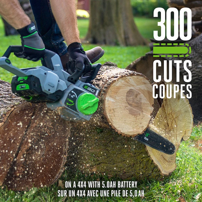 La tronçonneuse EGO Power+ de 18 po repense la coupe du bois avec davantage de puissance. Le moteur sans balais est conçu pour vous offrir la meilleure fiabilité, tandis que le système unique de tension de chaîne comprend un cadran rotatif pour un réglage de chaîne précis et facilité. Les grandes branches, les souches et les grands arbres ne peuvent résister au guide-chaîne affilé de 18 pouces Oregon, et la vitesse de rotation de 11 000 tours/min permet d’obtenir les coupes les plus nettes. Pour les travaux extérieurs au crépuscule ou en cas d’urgence et sans aucun accès à une source de lumière, vous pouvez compter sur la lumière vive des DEL intégrées. La batterie 5,0 Ah Power + utilise la technologie de pointe ARC Lithium(MC) pour une efficacité maximale, et peut être utilisée avec tout équipement d’extérieur EGO Power+. Cet outil EGO alimenté par batterie offre les performances des appareils à essence sans le bruit, la fumée et les encombres. Batterie et chargeur vendus séparément. Système de tension automatiqueBarre et chaîne de 18 pouces11 000 tr/min pour des coupes nettes et efficacesMoteur sans balai qui prolonge la durée de vie de l’outilPhares DEL lumineux : éclairez votre zone de travailGarantie de 5 ans sur l’outil, 3 ans sur la batterie