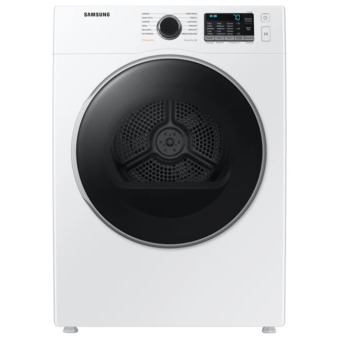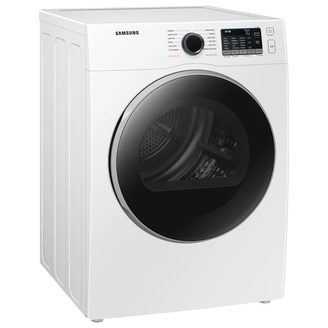 Cette sécheuse Samsung avec AI Smart Dial simplifie le panneau de commande de votre laveuse et rend la journée de lessive plus facile. La sécheuse électrique compacte intelligente de Samsung optimise automatiquement la durée et la température de votre cycle de séchage pour protéger vos vêtements des dommages causés par la chaleur, tout en évitant une consommation d’énergie excessive. Elle surveille en permanence l’état du conduit d’air de votre sécheuse pour s’assurer qu’elle fonctionne en toute sécurité et efficacement, tandis qu’une lumière interne vous permet de voir plus clairement le contenu de votre sécheuse. Contrôle en permanence l’état du conduit d’air de votre sèche-linge pour s’assurer qu’il fonctionne de manière sûre et efficaceLa fonction AI Smart Dial de Samsung, facile à utiliser, simplifie le panneau de commande de votre lave-linge et fait de la journée de lavage un jeu d’enfantLe panneau de contrôle vous permet de savoir quand il est temps de nettoyer le filtreAide à prévenir le surséchage pour un entretien optimal des tissusUn éclairage interne du tambour vous permet de voir plus clairement le contenu de votre sèche-lingeChoisissez le sens d’ouverture de la porte de votre sèche-lingeGrande capacité (4.0 cu. ft.)L’ensemble de superposition est livré avec l’ensemble de sécheuseLe sèche-linge électrique compact et intelligent de Samsung optimise automatiquement la durée et la température de votre cycle de séchage pour protéger vos vêtements des dommages causés par la chaleur, tout en évitant une consommation excessive d’énergie