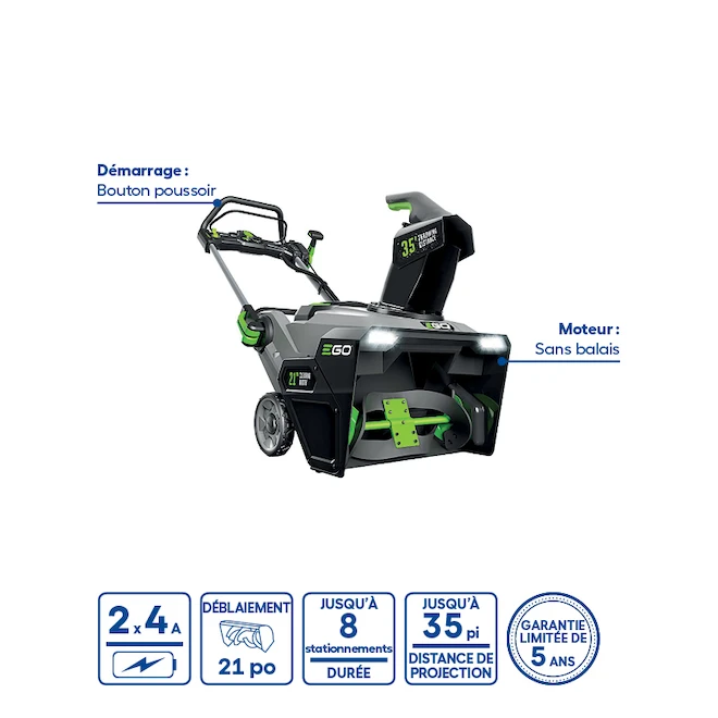 La souffleuse à neige EGO POWER+ offre la puissance et les performances des souffleuses à neige à essence sans le bruit, les tracas et les fumées. Dotée de la technologie Peak Power(TM), cette souffleuse à neige sans fil combine la puissance de deux batteries EGO 56V ARC Lithium(TM) quelconques pour obtenir les performances nécessaires au déblaiement de la neige la plus lourde et la plus mouillée. Construite avec un moteur sans balai à haut rendement et une largeur de déblaiement de 21 pouces, cette souffleuse à neige électrique sans fil peut gérer ce que le chasse-neige de la ville laisse derrière lui – et le projette jusqu’à 35 pieds. Réglez facilement la tarière à vitesse variable et le réglage à distance de la goulotte pour contrôler la distance à laquelle la neige est projetée. Le kit de souffleuse à neige EGO comprend deux (2) batteries de 4,0 Ah et le chargeur rapide. Faites l’expérience du Power Beyond Belief(TM) avec la souffleuse à neige EGO POWER+ et toute la gamme EGO POWER+. Ce produit est couvert par une garantie limitée de 5 ans. Résistant aux intempéries (IPX4)Le système de contrôle de la vitesse variable de la tarière permet de régler la distance de projection de la neigeLargeur de déblaiement de 21 poucesMoteur sans balai à haut rendementPoignée à pliage rapide pour un rangement compactDeux phares LED lumineux pour une meilleure visibilité lors du déneigement de nuitLa technologie Peak Power combine la puissance de deux batteries EGO POWER+ 56V ARC Lithium au choixDéplace une allée de 8 voitures avec 8 pouces de neige en une seule charge avec les deux batteries ARC Lithium 4.0Ah inclusesProjette la neige jusqu’à 35 pieds