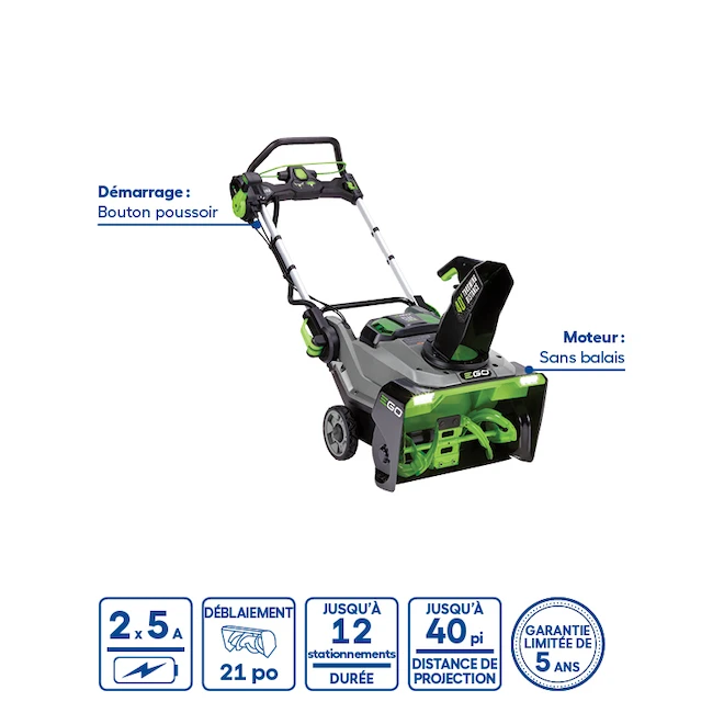 La nouvelle souffleuse à neige EGO POWER+ offre la puissance et la performance de l’essence sans le bruit, l’agitation et les fumées. Doté de la technologie Peak Power(TM), il combine la puissance de deux batteries EGO 56V ARC Lithium(TM) pour dégager la neige lourde et humide avec une distance de projection jusqu’à 40 pieds. Construit avec un moteur sans balai à haute efficacité et une tarière en acier. Dégage 20 cm (8 po) de neige sur une allée de 12 voituresMoteur sans balai à haut rendementLargeur de dégagement de 21 poucesCommande de tarière à vitesse variableConstruction robuste en acier et composite, résistant aux intempéries, pour faire face aux conditions difficiles2 phares DEL lumineux pour une visibilité accrue lors du déneigement de nuitLa technologie Peak Power(MC) combine la puissance de 2 batteries ARC Lithium(MC)EGO de 56 V et 5,0 AhLance de la neige à une distance maximale de 12,2 m (40 pi)La tarière en acier coupe la glace et la neige 50 % plus rapidement