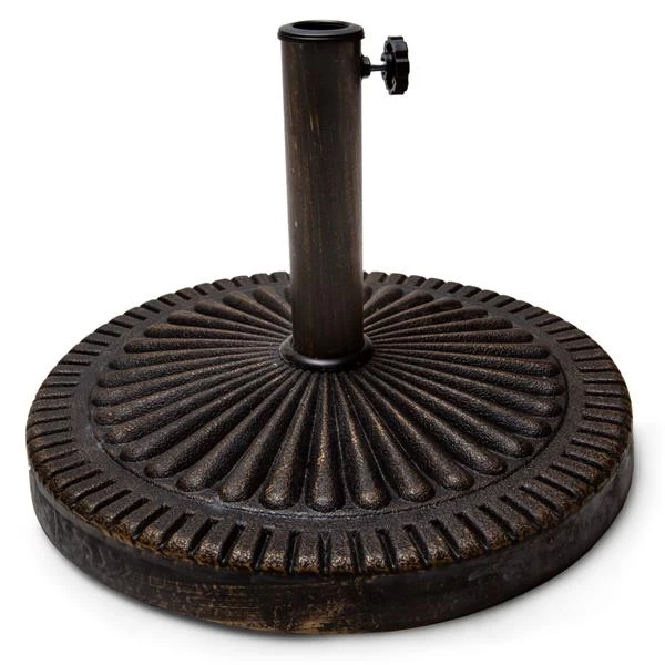 Support pour parasol avec une base de fer lourde enduit de résine. Accepte les poteaux de 1,5 à 2 pouces de diamètre. Base lourde, résiste aux vents forts et semble bien le faire.Support pour parasol avec base de fer enduit de résineCompatible avec des poteaux de diamètre de 1,5 à 2 poucesCompatible avec nos parasols de terrasse UB33 et nos parasols en teck TU90Poids: 32 livresDimension: 20″x 20″x 14″