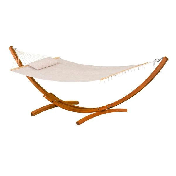 Support pour hamac avec hamac durable et stylé avec coussin, incluant un dispositif de suspension et des chaines en acier zingué résistant à la rouille. Profitez d’un moment de relaxation; ayez l’idée d’un livre ou rêvez tout simplement avec un sommeil profond. Ce support pour hamac avec hamac vous permettra de vivre des heures de repos et de tranquillité. Très spacieux, abordable et fabriqué pour durer toute une vie. Et comme ce produit est fabriqué à partir de toile de polyester plastifié solide, vous apprécierez pleinement les niveaux supplémentaires de stabilité et de confort qu’offre ce hamac.Le seul endroit pendant les nuits chaudes d’été ou pour fuir les beaux-parents.Un nouveau style par rapport à la conception de hamac traditionnelle (126 » L x 47 » P x 47 » H)Surface de relaxation faite à base de Texteline, hautement respecté pour la fabrication de mobilier extérieur au cours des dernières décennies.Surface en bois façonnée à base de mélèze pour ses qualités solides, durables et sa résistance à l’eau; un bois connu pour sa longévité et son utilisation dans la construction de la ville de Venise Deux crochets à arbre (dispositif de suspension) inclusL’enduit protecteur protège contre les intempéries