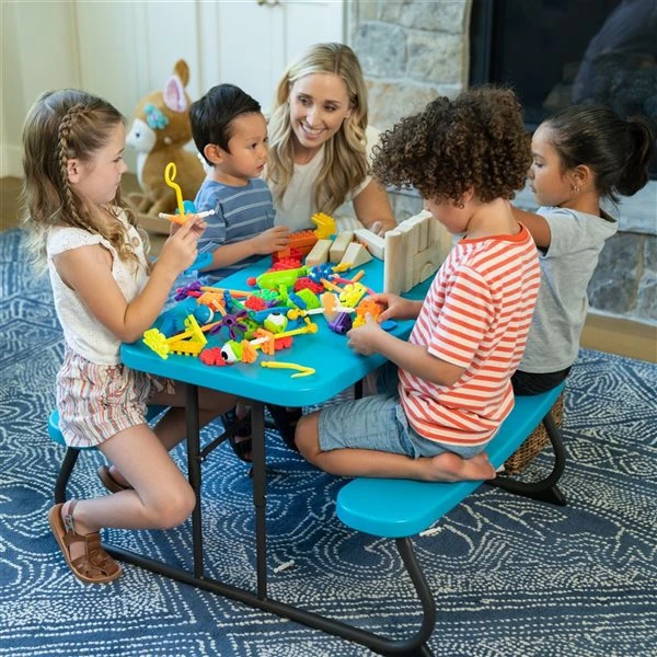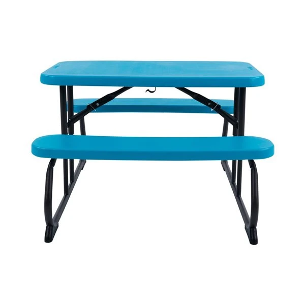 Table de pique-nique pour enfants Lifetime – Le plateau en PEHD (polyéthylène haute densité) de 32,5 x 19 po est résistant aux taches, facile à nettoyer, et se plie à plat pour le rangement. Ce modèle est livré bleu glacier avec un cadre pliant en métal noir. Garantie limitée de 2 ans.Pieds antidérapantsCadre en acier durable avec finition toutes saisonsPlateau de table et bancs en PEHD (polyéthylène haute densité) protégé contre les UVAucun assemblage requisRecommandé pour les enfants de 3 à 8 ansNe se fissure pas, ne se casse pas, ne rouille pas et ne s’écaille pas.Quatre enfants peuvent s’asseoir confortablementMécanisme simple à goupille pour le montage et le démontage.Résistant aux taches et facile à nettoyer