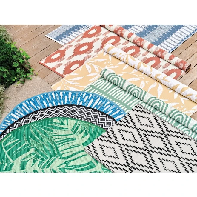 Profitez d’une journée d’été à la plage, d’un pique-nique ou du votre bord de piscine avec ce tapis en plastique tissé. Il se roule facilement pour se rendre à la plage ou sur le terrain de jeu, et il est facile à entretenir. Idéal pour une utilisation extérieure dans les zones abritées, notamment les entrées, les patios, les porches, les vérandas, les balcons et les garages. Son motif en oléfine tissée est réversible. Ce tapis résistant aux rayons UV et à l’eau protège les sols, les terrasses ou les patios de l’usure. Balayer, passer l’aspirateur ou rincer avec un tuyau d’arrosage ; ne pas laver à la machine ni sécher par culbutage et ne pas utiliser d’agent de blanchiment. Motif en oléfine tissée réversibleTapis résistant aux rayons UV et à l’eau qui protégera les planchers, les terrasses ou les patios de l’usureAjoutez une touche de couleur et de design à votre patio d’arrière-courIdéal comme tapis de pique-nique ou de plagePour prolonger la durée de vie du tapis, couvrez-le ou rangez-le lorsqu’il n’est pas utiliséBalayer, aspirer ou rincer avec un tuyau d’arrosage, ne pas laver ou sécher à la machine