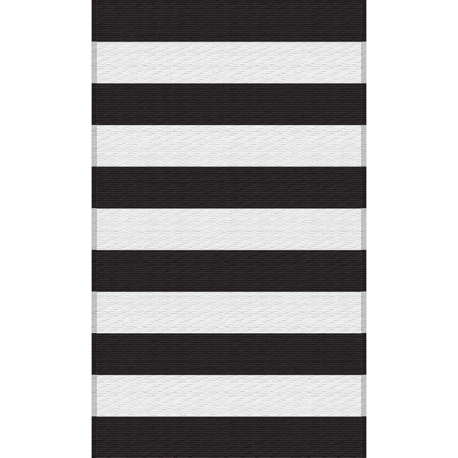 Profitez d’une journée d’été à la plage, d’un pique-nique, du bord de la piscine ou de votre porche avec ce petit tapis tissé en polypropylène Multy Home. Doté de rayures blanches et noires, le tapis Cabana se roule de façon pratique et il est simple d’entretien. Parfait pour une utilisation extérieure dans un endroit couvert comme une entrée, un patio, un porche, une véranda, un balcon ou un garage. Motif en oléfine tissée, réversibleTapis résistant aux rayons UV et à l’eau qui protégera les sols, les terrasses ou les patios de l’usureAjoutez une touche de couleur et de design à votre patio d’arrière-courIdéal comme tapis de pique-nique ou de plagePour prolonger la durée de vie du tapis, couvrez-le ou rangez-le lorsqu’il n’est pas utiliséBalayer, aspirer ou rincer avec un tuyau d’arrosage, ne pas laver ou sécher à la machine