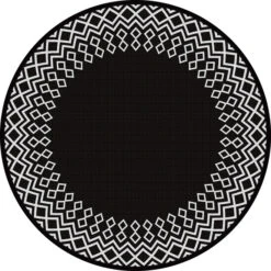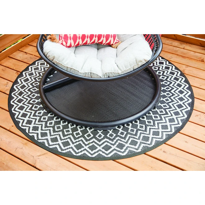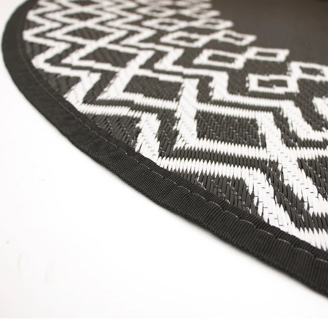 Ce magnifique tapis rond poly-tissé avec motif réversible en oléfine donne une touche agréable et colorée à tout espace extérieur. Il s’enroule facilement pour que vous puissiez le transporter à la plage ou au terrain de jeu et est facile à nettoyer. Idéal pour les endroits couverts à l’extérieur de la maison, y compris les entrées, les patios, les porches, les vérandas, les balcons et les garages, il peut également être utilisé comme tapis de pique-nique ou de VR. La finition du tapis résiste aux rayons UV et à l’eau. Motifs géométriques blancs à bordure noire. Motif en oléfine tissée réversibleTapis résistant aux rayons UV et à l’eau qui protégera les planchers, les terrasses ou les patios de l’usureAjoutez une touche de couleur et de design à votre patio d’arrière-courIdéal comme tapis de pique-nique ou de plagePour prolonger la durée de vie du tapis, couvrez-le ou rangez-le lorsqu’il n’est pas utiliséBalayer, aspirer ou rincer avec un tuyau d’arrosage, ne pas laver ou sécher à la machine