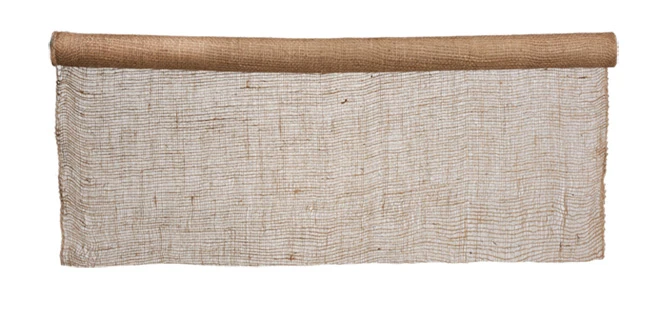 Toile de jute tout usage. 9 m de longueur x 1 m de largeur. Pour la protection des arbustes ou du sol et l’entaillage des arbres pendant la saison hivernale. Aussi offerte en 4,5 m x 1 m.