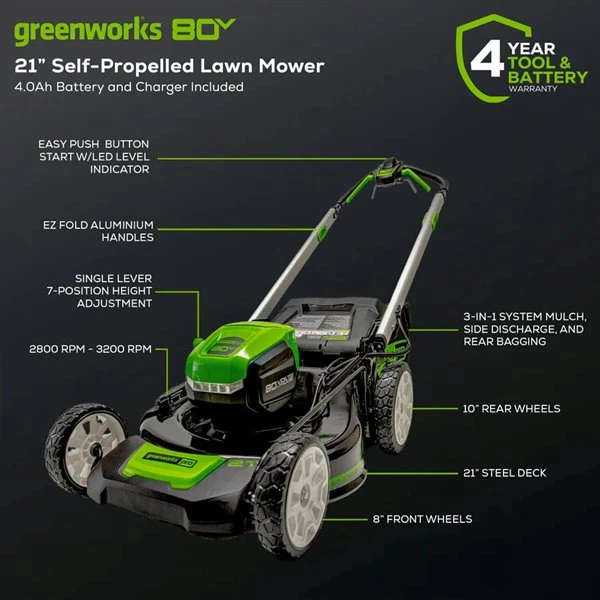 Tondeuse à Gazon Sans Fil Greenworks Autotractée Sans Balais De 21 Po, 80 Volts Au Lithium-ion (batterie Et Chargeur Inclus)
