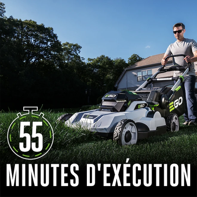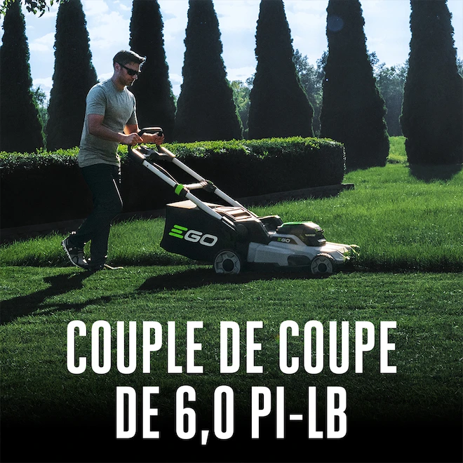 La tondeuse Ego Power+ 21 pouces offre un couple de 6,0 pieds-livres (une puissance qui dépasse l’essence sans le bruit, les tracas ou les émanations). Le moteur sans balais à haut rendement offre de longues durées de fonctionnement, de faibles vibrations et une durabilité à vie. Cette tondeuse à gazon électrique offre jusqu’à 55 minutes d’autonomie sur une seule charge avec la batterie 56V ARC Lithium(MC) incluse. La tondeuse à gazon sans fil offre une coupe de précision avec sa lame de déchiquetage avancée et sept positions de hauteur de coupe de 1,25 à 4 pouces, réglables d’une seule main. La fonctionnalité trois en un offre votre choix de paillage, d’éjection latérale ou d’ensachage de vos tontes de gazon ; un sac de collecte d’herbe à deux boisseaux facile d’accès est inclus. Cette tondeuse à gazon poussée comprend des lumières DEL lumineuses pour une meilleure visibilité lors de la tonte à l’aube ou au crépuscule, et elle se replie à plat pour un rangement compact entre les coupes. Découvrez Power Beyond Belief(TM) avec la tondeuse à gazon EGO POWER+ de 21 pouces. réglage de la hauteur de coupe à 7 positions : 1,25 à 4 poucesDémarrage rapide et facile par bouton-poussoirplateau de 21 poucesJusqu’à 55 minutes d’autonomie sur une seule charge avec la batterie ARC Lithium 56V 6.0Ah incluseLe moteur sans balai à haut rendement offre de longues durées de fonctionnement, de faibles vibrations et une durabilité à vieOffre un couple de coupe de 6,0 pi-lb pour des performances supérieures à celles des tondeuses à gazon à essenceFonction 3 en 1 : mulching, ensachage, éjection latéralePhares DEL brillantsTable à hauteur ajustable