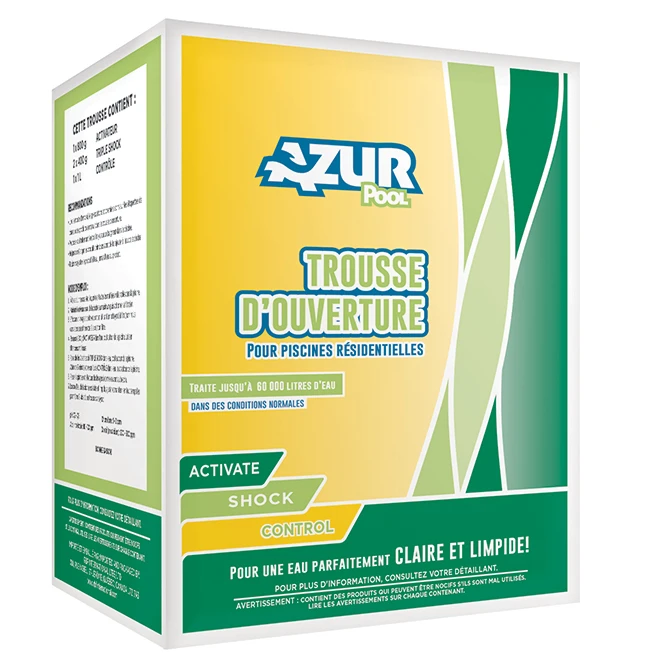 Soyez prêts pour la saison estivale avec la trousse d’ouverture de piscine Azur. Elle permet le traitement des piscines possédant un volume d’eau maximal de 60 000 litres. Chaque trousse comporte 800 g d’activateur, 1 litre de contrôle et 2 triple chocs de 400 g. Traite jusqu’à 60 000 litres d’eau dans des conditions normalesTraite jusqu’à 60 000 L d’eau dans des conditions normalesLa trousse contient 800 g d’activateur de chlore, 1 L de clarifiant, et 2 triple choc de 400 gTenir hors de portée des enfants, toujours lire l’étiquette avant l’utilisation