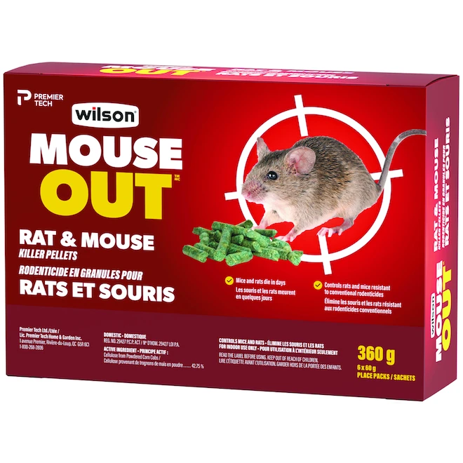 Pastilles d’appât pour rats et souris, contient 360 grammes. Les souris et les rats meurent en quelques jours. Sert à contrôler les souris et les rats qui sont résistants aux rodenticides conventionnels. Pour usage intérieur seulement. Formule à base de cellulose de maïsLes granulés à base de maïs perturbent le système digestif des rongeurs et provoquent une déshydratationLes souris et les rats meurent en quelques jours